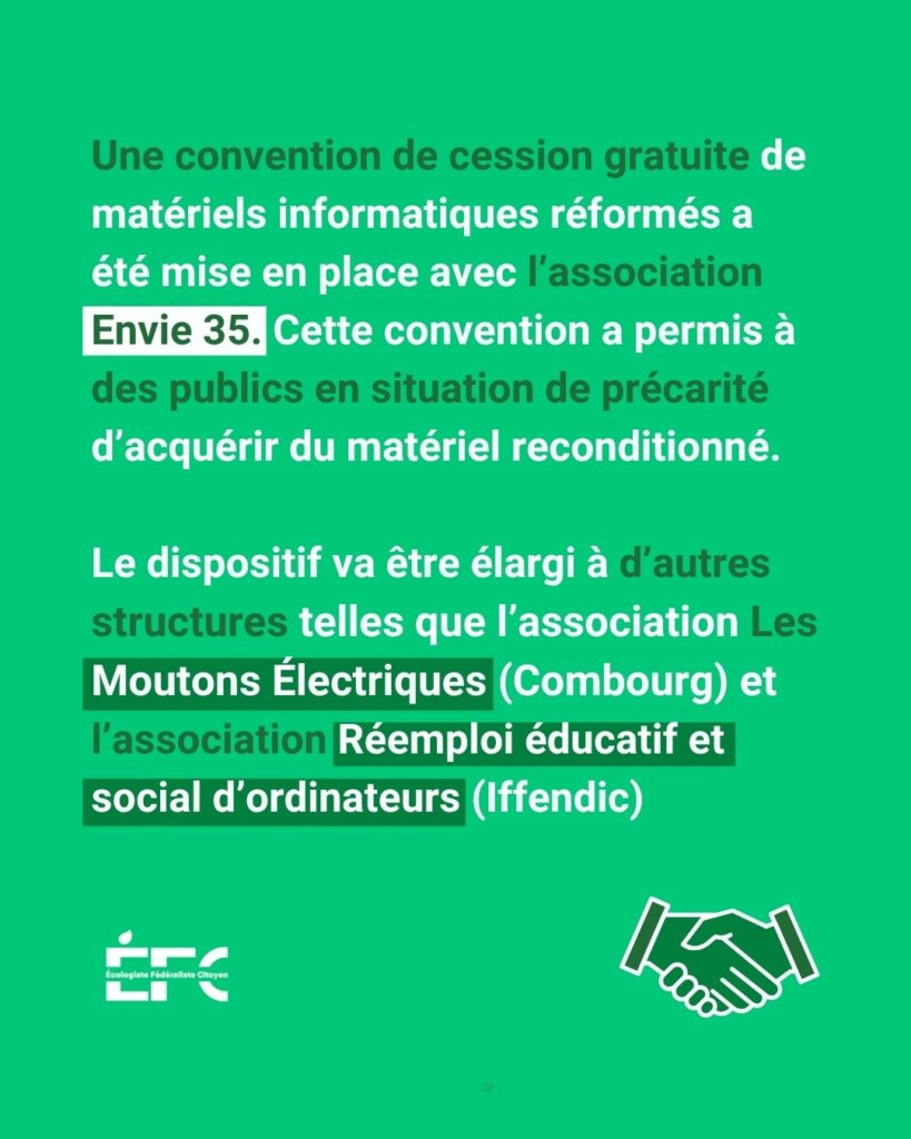 👉Une convention de cession gratuite de matériels informatiques réformés a été mise en place avec l’association Envie 35. Cette convention a permis à des publics en situation de précarité d’acquérir du matériel reconditionné.